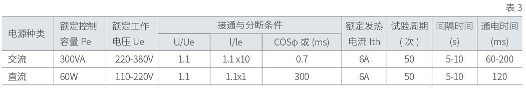 輔助開關的接通與分斷能力(見表 3),其機械壽命為 20000 次,電壽命為 10000 次