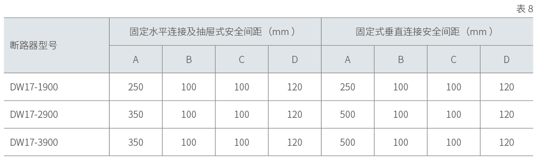 斷路器安全間距(包括飛弧距離)(見表 8)