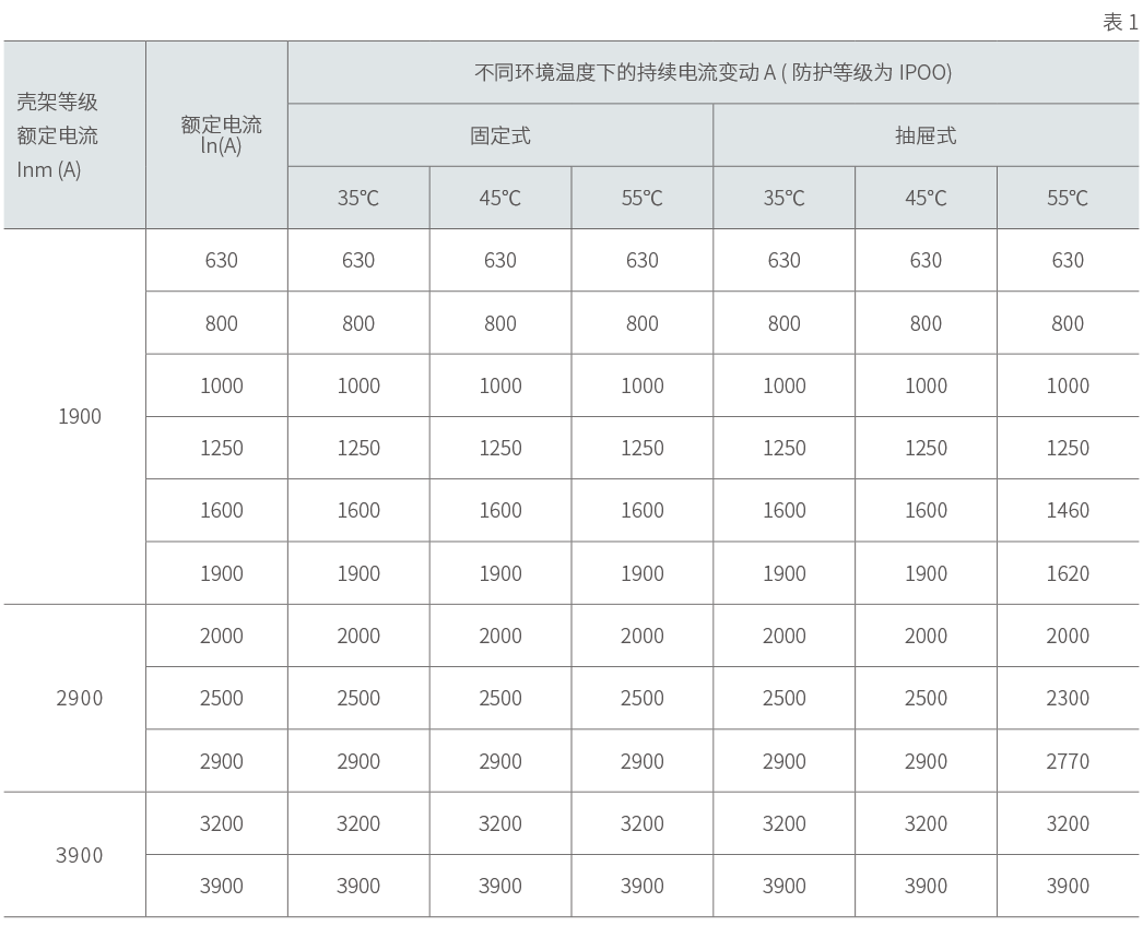 斷路器地不同環(huán)境溫度下的持續(xù)電流變動(見表 1)