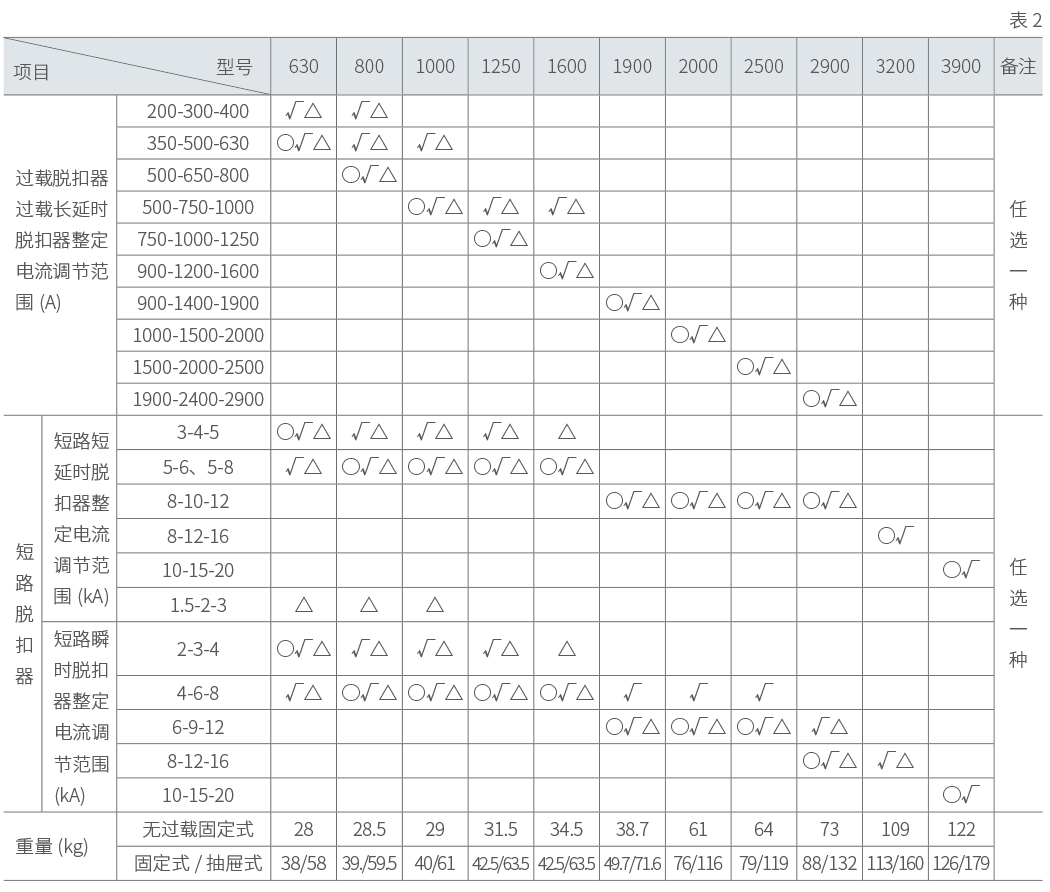 注 :(1)表中“√ " 為三極斷路器選項, " △ " 為四極斷路器選項,“○ " 為默認配置標記。