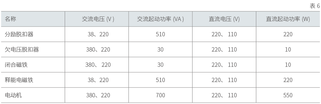 分勵脫扣器、欠電壓脫扣器、閉合磁鐵、釋能電磁鐵與操作電動機的性能(見表 6)