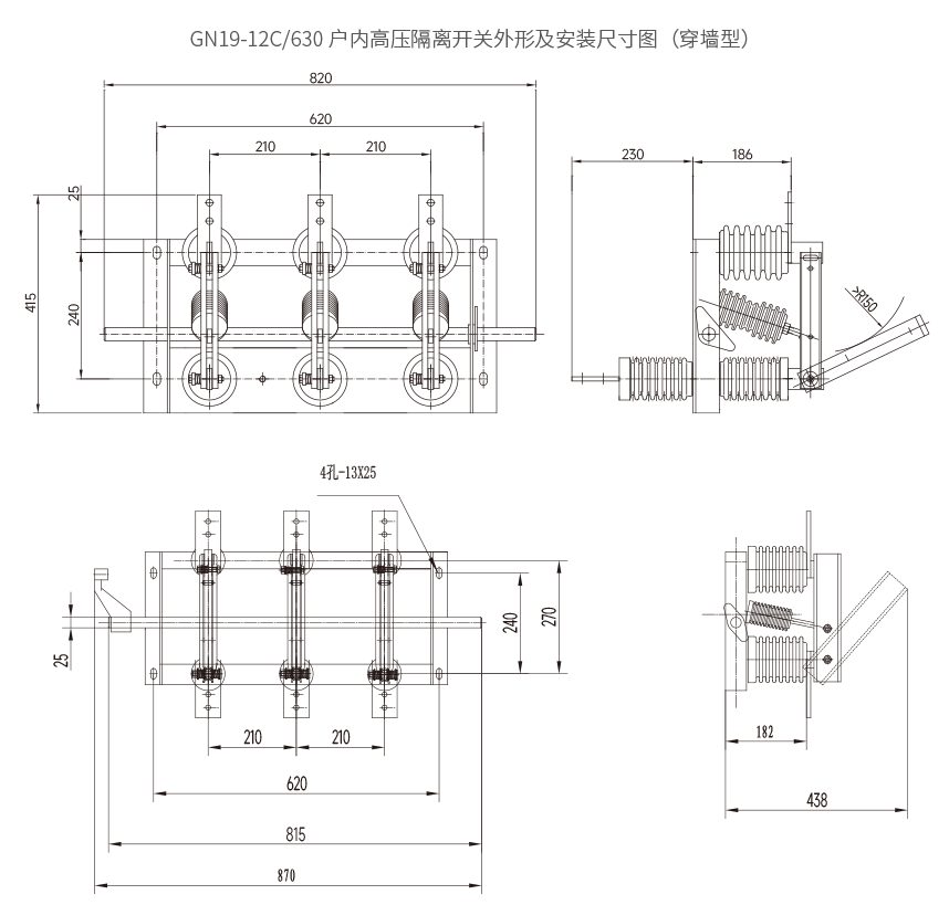 GN19-12 型系列戶內(nèi)高壓隔離開關(guān)系高壓開關(guān)設(shè)備,用于額定電壓 12kV,交流 50Hz 及以下電力系統(tǒng)中,配用 CS6-1 型人力操作機構(gòu),作為在有電壓而無負載的情況下,分、合電路之用,亦有派生產(chǎn)品防污型、高原型的和加裝帶電顯示裝置等。