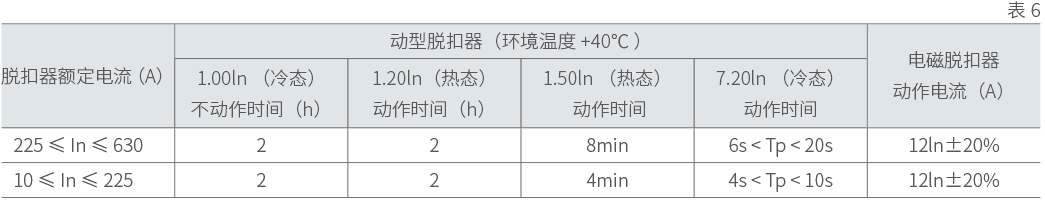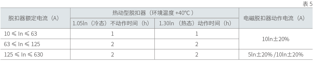 斷路器熱動(dòng)型脫扣器具有反時(shí)限特性 ; 電磁脫扣器為瞬時(shí)動(dòng)作,配電用見(jiàn)表 5