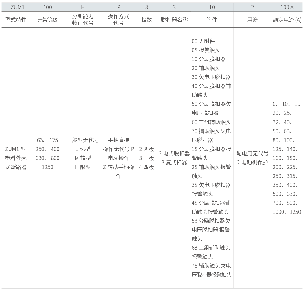 例如:訂貨 ZUM1-125L、50A、三極、電動機(jī)保護(hù)、分勵脫扣器(AC230V)、電動操作機(jī)構(gòu)(AC230V)。數(shù)置 10 臺,訂貨代號為 ZUM1-125LP/33102(AC220V)